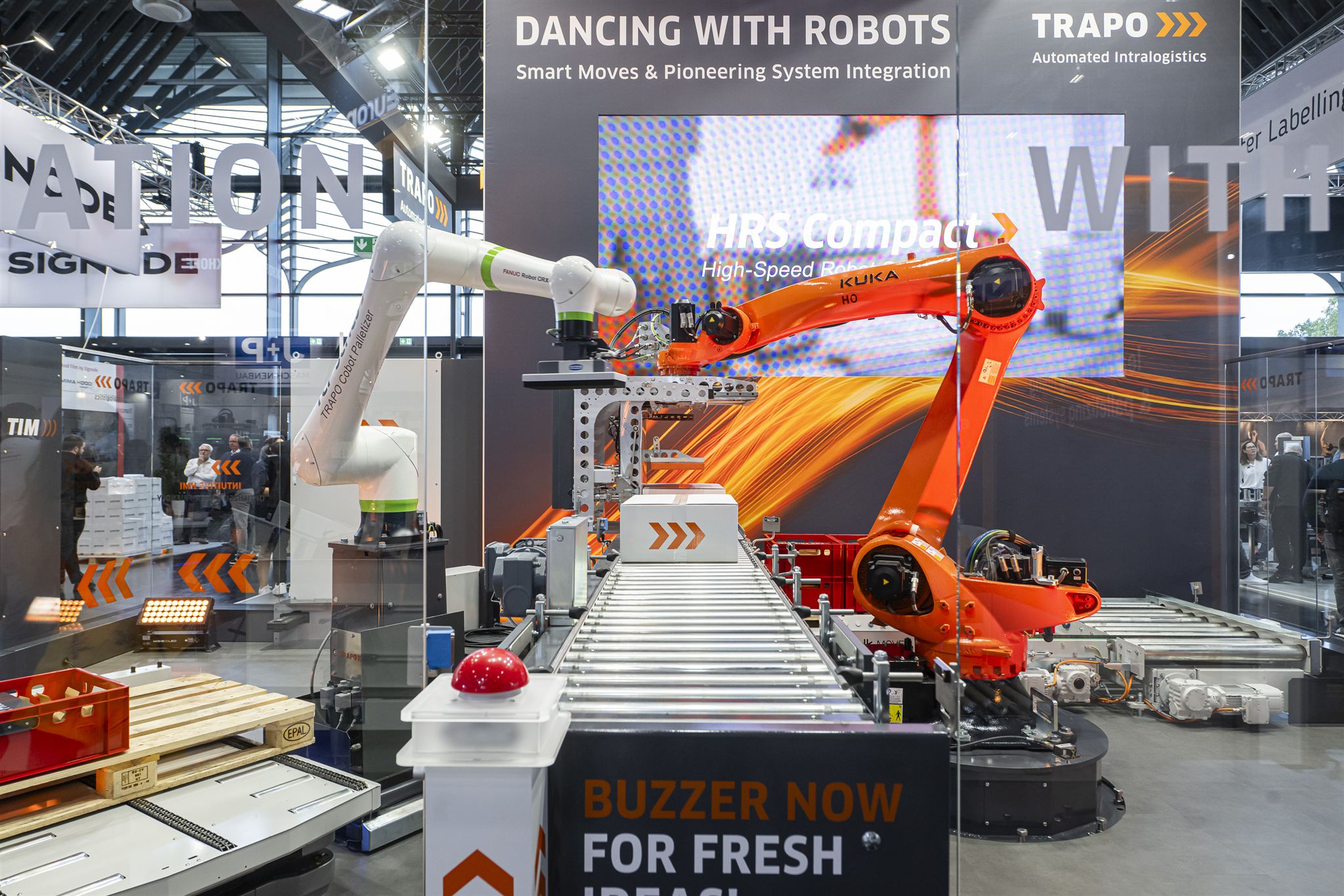 In its anniversary year, TRAPO presented the live performance “Dancing with Robots,” which was just as popular as the buzzer that allowed trade fair visitors to request “Sweets for Friends.” TRAPO traditionally serves up complex intralogistics automation layouts with a wink. This time, the performers called for “Rock’n Roll Babe”: two interacting robots that demonstrated perfect carton and crate handling.